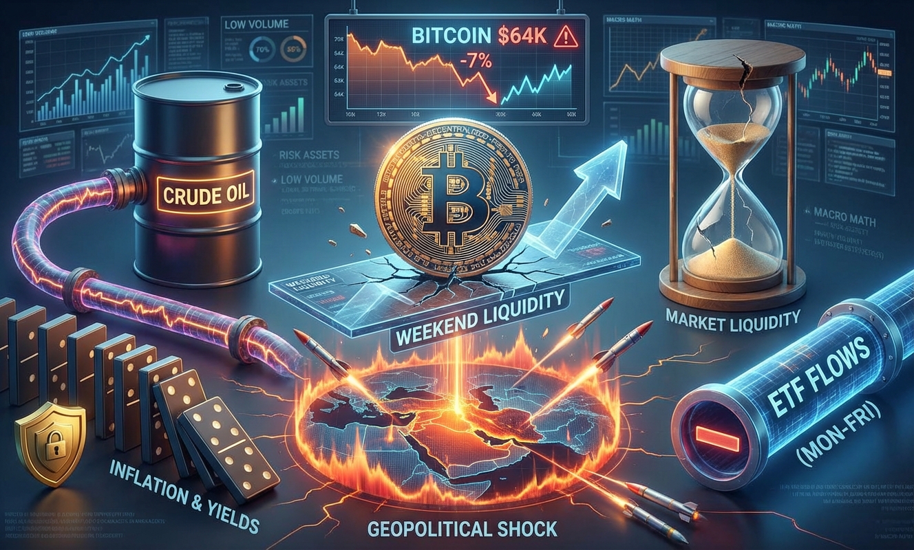 Missiles flew over the weekend. Bitcoin dropped 7%, then clawed back to mid-$64,000s. And right now, half the crypto crowd is calling it “resilience.” Let’s be real. It wasn’t resilience. It was a low-liquidity bounce inside a structurally broken weekend market, and the real test hasn’t even started yet.